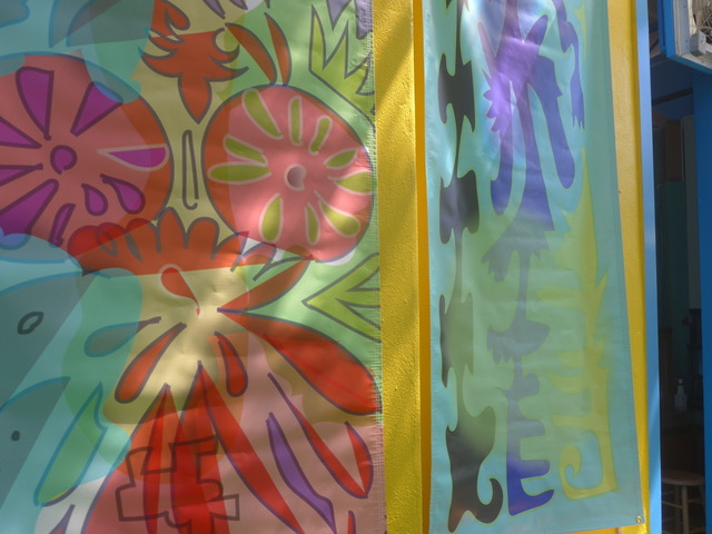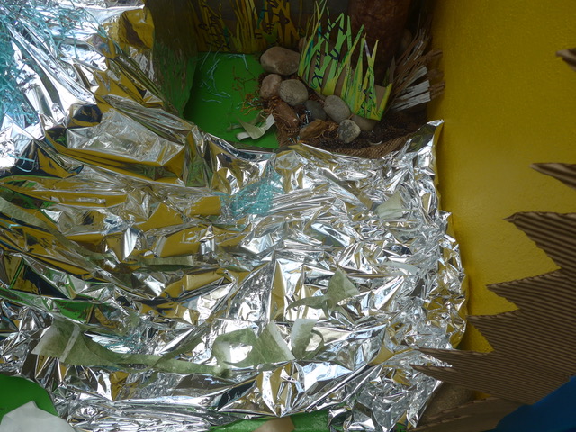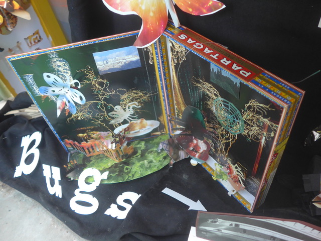 “The installations are a wildly diverse experiment using materials as inspiration,” said Sally. “We created a Mylar ‘waterfall’ filled with bugs made from repurposed cookbooks from Kitchenality and Barb’s Tyvek color experiments.”